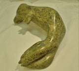 The Inuit did not have much experience hunting bearded seals as they only ranged throughout part of the Arctic. They are very large in stature - three to four times a harp or harbour seal's size. Due to their lack of experience with bearded seals there are few sculptures of them. Beautiful Arctic serpentine polished green stone with brown veins. No base. Probably 1970s. No signature or markings.