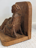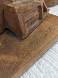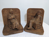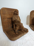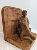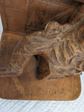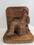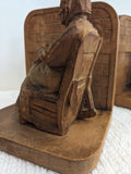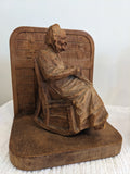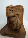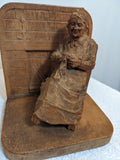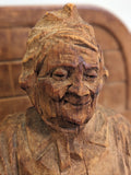 Exquistly carved Grandma and Grandpa sitting by the fire. Each carving consists of 3 pieces; base (floor); fireplace (back) ; and the human subject. Rifle above fireplace on male piece. Jug and candle on mantle on female piece. Faces are both exceptional. Estimate 1950's. Condition is consistent with age. Please note missing feet and one rocker on the Grandmother carving along with repair on base.