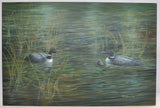Stephen Hewer is a talented wildlife painter. This scene of a family of loons is tranquil and calming. While the loons are expertly painted in great detail, it is the grasses and light reflecting across the water that makes this Hewer’s masterpiece. Unframed. Acrylic on board. 1995