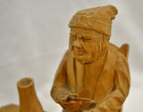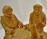 Sculptures of four card players are much rarer than those with two. This sculpture is also unique in that two elderly couples are presented. Like most of the Bourgault family, Lucien has master sculpting skills that can be seen in the quality of the faces, detailing on clothes and natural postures. His carving of hands is uneven. Carved from more than one piece of wood (cards and accessories).