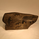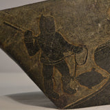 This is a very unique sculpture. On one side, and Inuit with a spear is hunting a polar bear with his dogs. On the other side the hunter, with a harpoon, is after a walrus in the water. Carved in relief with etching this piece feels like a miniature cave painting. The carved background on one side is snow (polar bear) and on the other side it illustrates the edge of an ice floe (walruses). Est. 1970s.