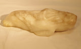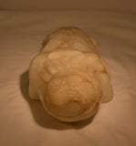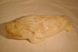 Sedna is an Inuit creation story of sea mammals. This Sedna adopts the more traditional form of a seal rather than mermaid body, however, the flippers are horizontal consistent with most contemporary sculptures. This large sculpture is most unique for the interesting facial perspective. The face is on top of the head looking up. Holes in back seem to be for specific purpose. Stone is white BC Alabaster. Stable sculpture is ideal for a coffee table/high activity area.