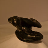Beautiful lines, curves and architecture in this sculpture of a bird catching a fish. Stylized wings with etched straight lines makes this sculpture unique. Very tactile. Black Arctic stone. Stable base. Est. 1970.