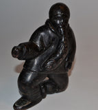 Very unusual sculpture with Inuk Fisher Biting Tail of Big Fish. Primitive small sculpture. Detail and perspective of kneeling legs and negative space is also interesting. Black Arctic stone. Missing fishing pole and line. Estimate 1960s.